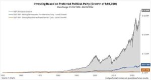 Both Democrats and Republicans predict Armageddon if the other is elected, so it may seem logical to only invest when “your” party occupies the White House. According to Y-Charts, if you invested $10,000 in the S&P 500 on Jan. 3, 1950 and left it alone, on June 28, 2024 (almost 75 years later) you would have had $3,278,000. However, if you were only invested during Democratic ($421,450) or Republican ($77,720) administrations over the same period, you would have had dramatically less (87% less with Democratic-only and 98% less with Republican-only). Clearly, letting partisan passions control your investment decisions can be very costly.