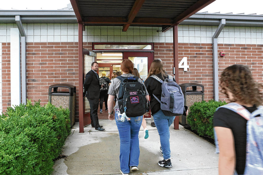 Carla Clark | For The Republic Kris Fortune, principal Hauser Jr-Sr High School, at left, welcomes students on the first day of school at the Flat Rock-Hawcreek School Corporation, Hope, Ind., Wednesday, August 7, 2024.