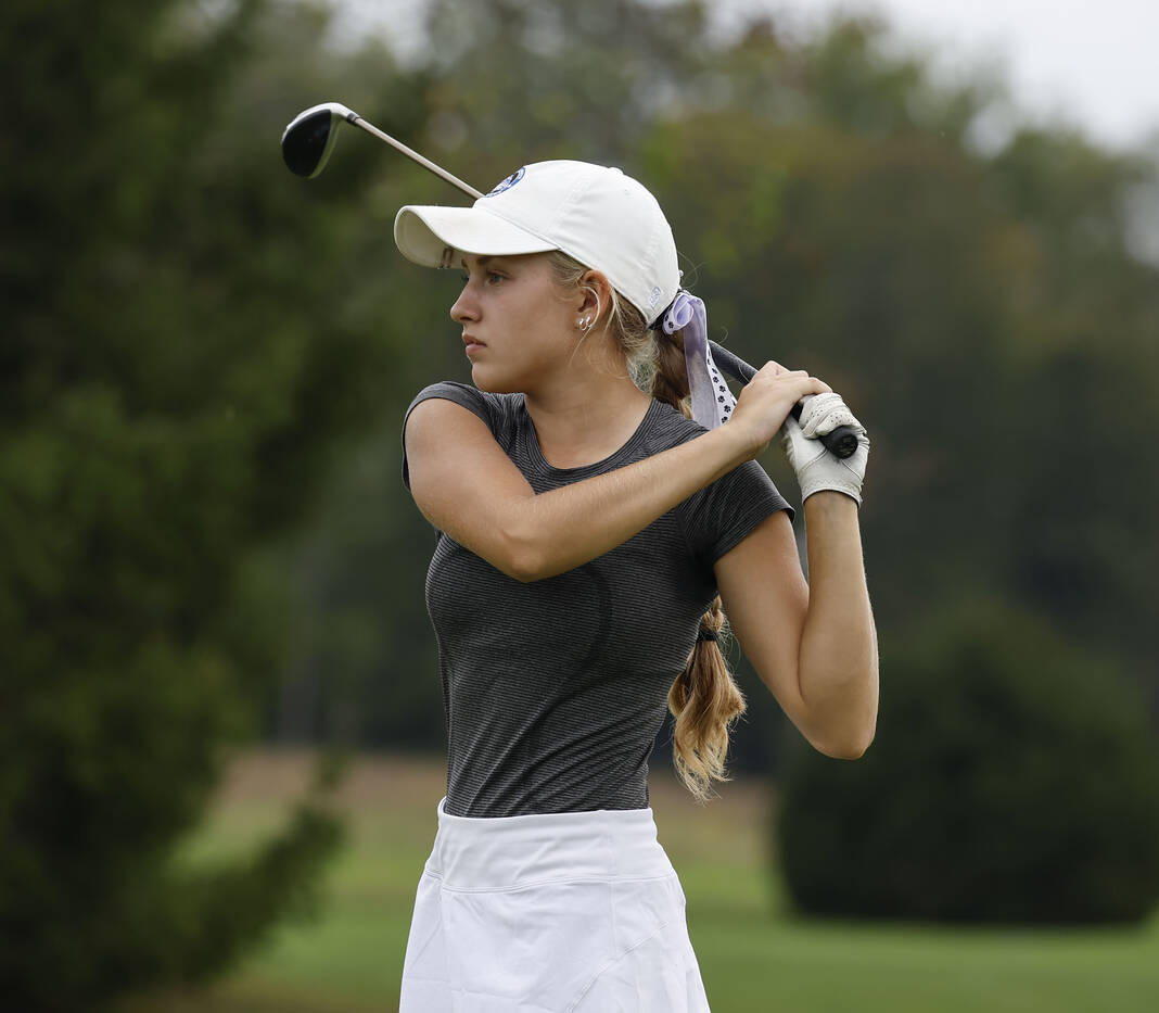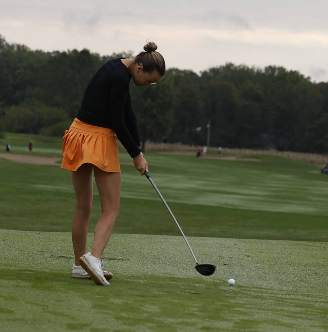Columbus North’s Erin Hopkins watches her tee shot on the par-3 second hole during the Franklin Regional at The Legends Golf Club.