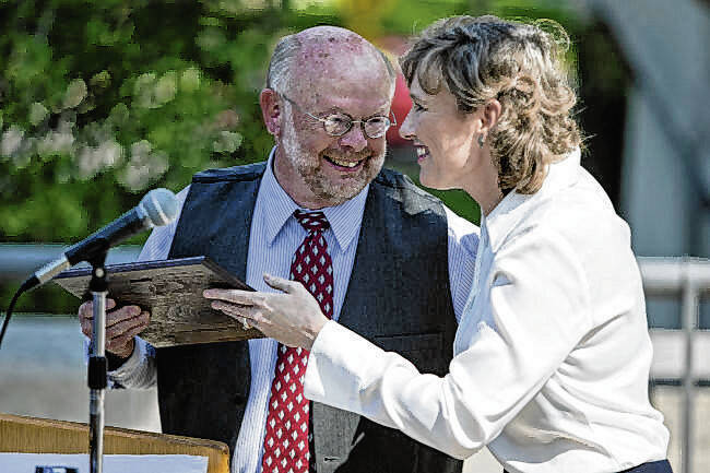 Kelly Benjamin of the Domestic Violence Action Team gives the Angel Award to Larry Perkinson, the Bartholomew County School Corp.’s student assistance coordinator, during the Men Take a Stand Against Domestic Violence march on Oct. 1, 2014.