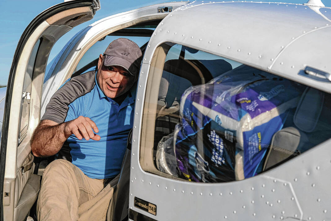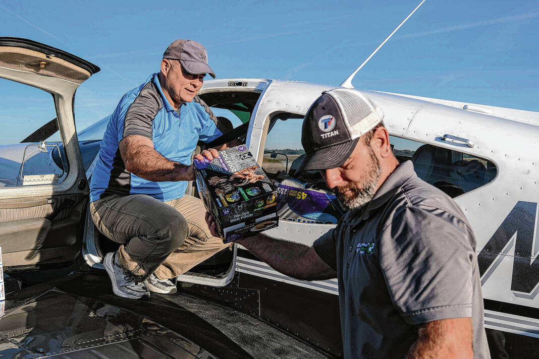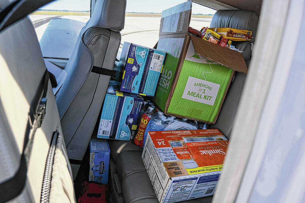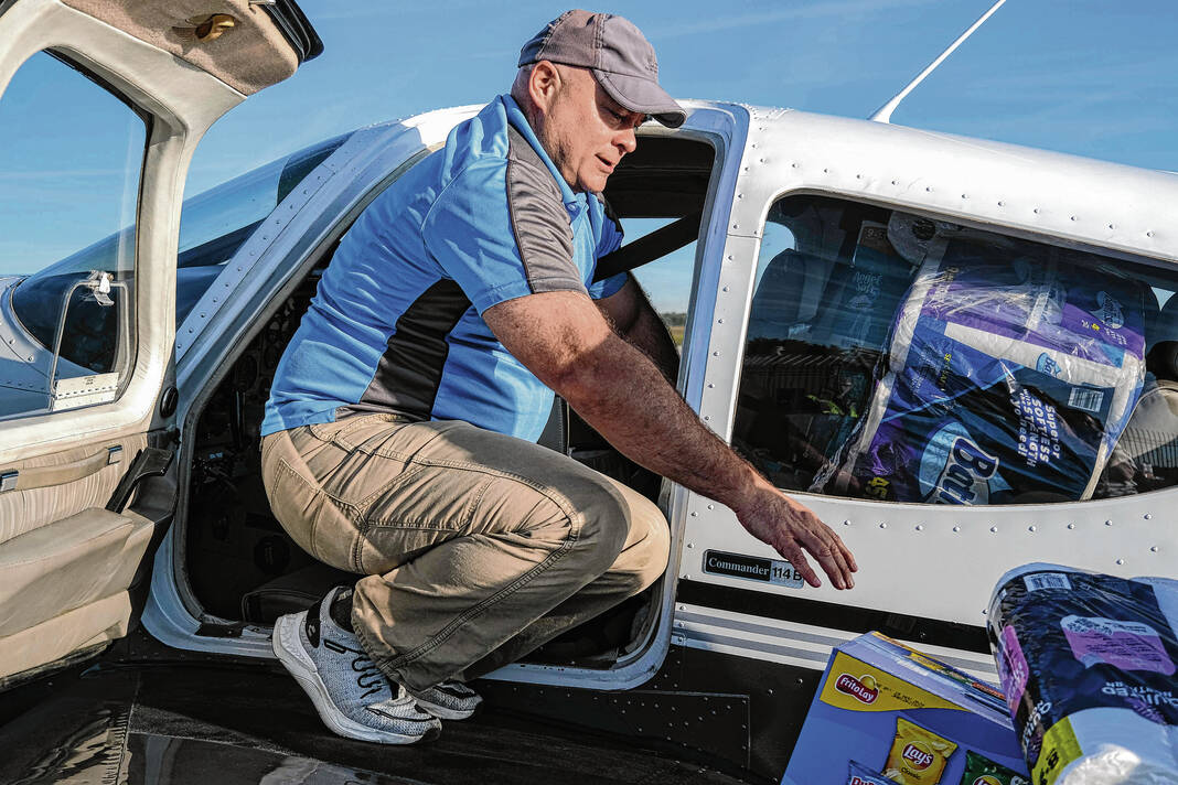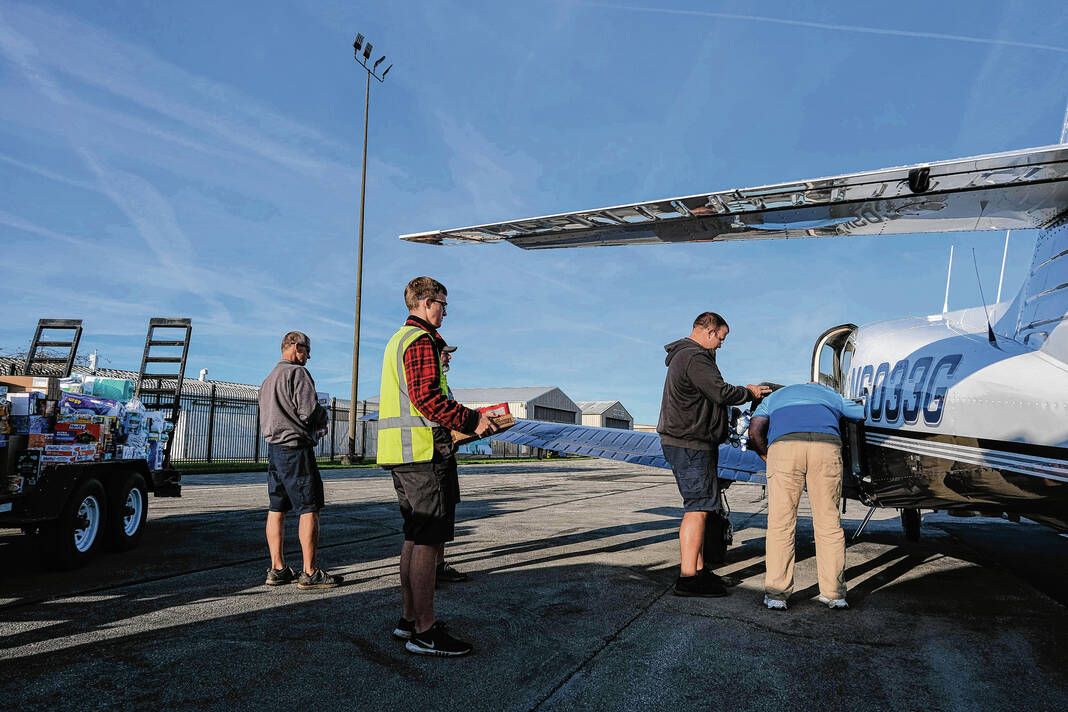 Mike Wolanin | The Republic Pilot Jeff Anderson, of Bardstown, Kentucky, packs his plane full of hurricane relief supplies at Columbus Municipal Airport in Columbus, Ind., Wednesday, Oct. 2, 2024. Relief efforts were organized by Civilian Crisis Response Team. Supplies were dropped off at the airport and flown to area impacted by Hurricane Helene.