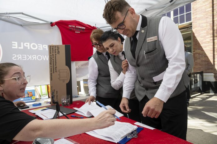 Workers picketed outside the Sheraton Grand Sacramento Hotel this week to demand higher pay and better benefits. Across the U.S. this year, thousands of hotel workers have gone on strike to fight for fair pay and workloads in the wake of COVID-era cuts.