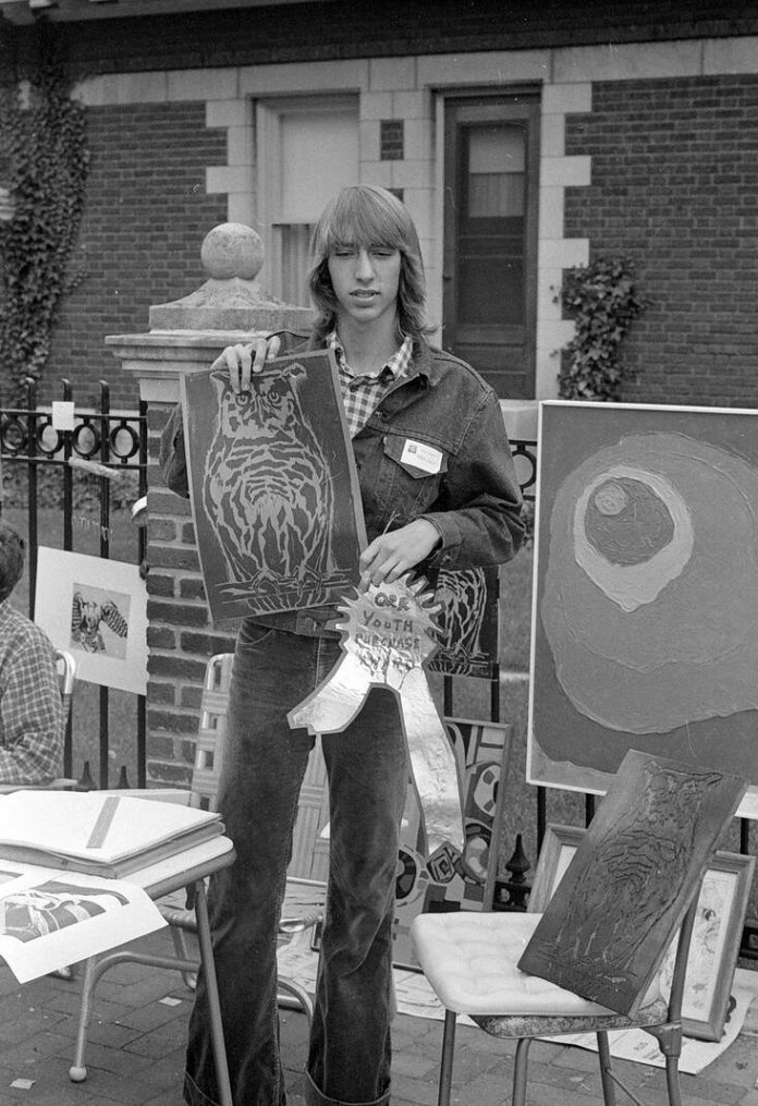 Mike Walsh, Columbus East High School senior, holds a woodcut print which won him the first Tom Orr Purchase Award on Oct. 14, 1974.