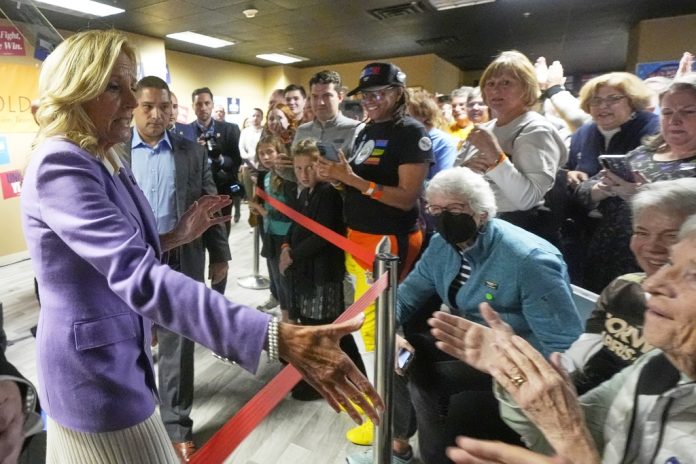 CLAWSON, Mich. (AP) — Jill Biden wasted no time after she stepped up to the microphone at a suburban Detroit restaurant.