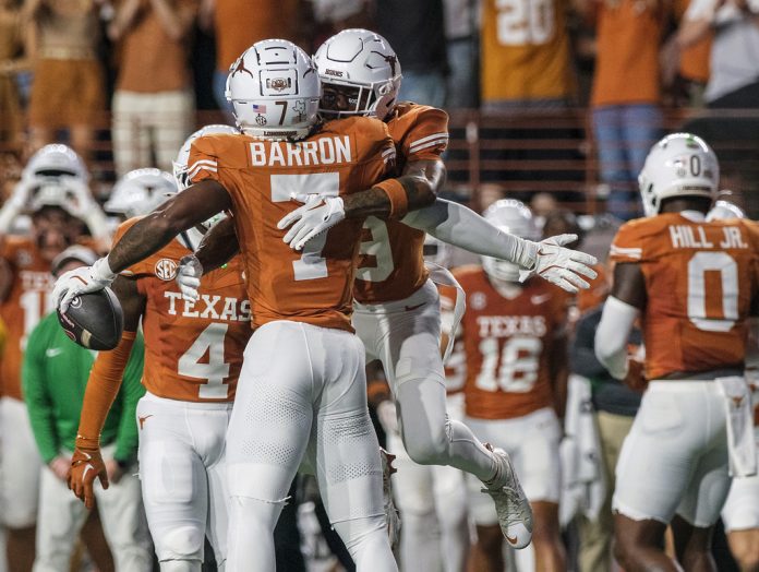 Longhorns coach Steve Sarkisian was irate at officials for the call that had appeared to take away Barron’s 36-yard interception return to the Georgia 9. The coach then headed toward the far corner of the field signaling to the student section to settle down and quit throwing things.