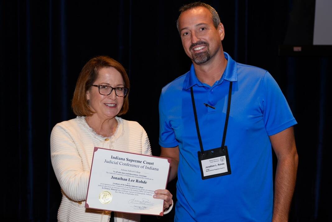 Photo provided ndiana Supreme Court Chief Justice Loretta Rush is shown with Bartholomew Superior Court 2 Judge Jon Rohde, who has graduated from the Indiana Judicial College.