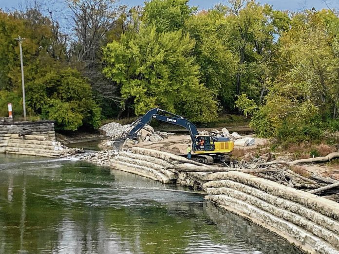 W Enterprises, a company contracted with Ecosystems Connections Institute, is completing the work. The contractor is removing the limestone slabs from the dam using an excavator. The stones are being moved to a site in the town, with some of the limestone to be saved for a future dam remembrance project. Once all the stone is removed, the company will clean up debris caused by the demolition, said Jerry Sweeten, senior ecologist for Ecosystems Connections Institute.