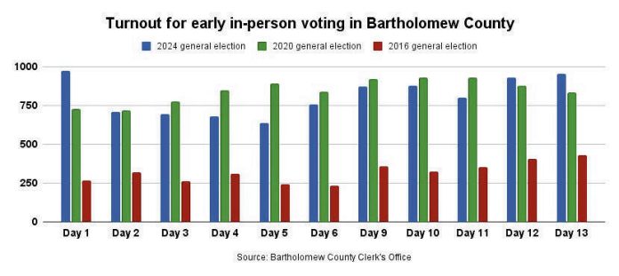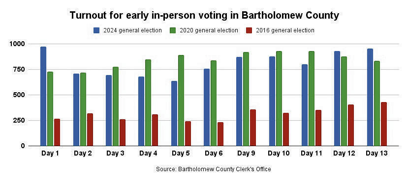 Local election officials and party leaders have said that a high level of interest in the presidential race is likely fueling the high turnout so far, though local contests such as the BCSC school board races may also be driving people to go out and vote early.