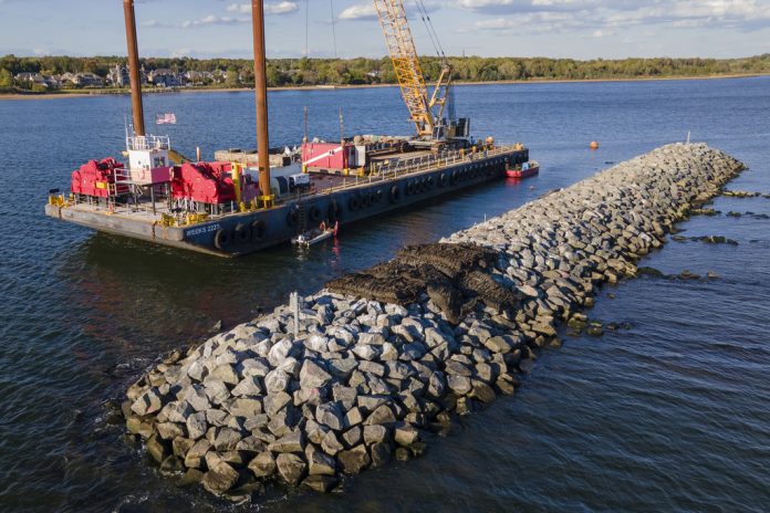 Funded with $111 million in Sandy recovery money, the “Living Breakwaters” constructed about 1,000 feet (300 meters) off the Tottenville beach were conceived to protect residents from future storms. While the concrete and rock barriers can’t stop flooding, project designers say they will sap the force of ocean waves, reducing daily erosion and damage from future storms.