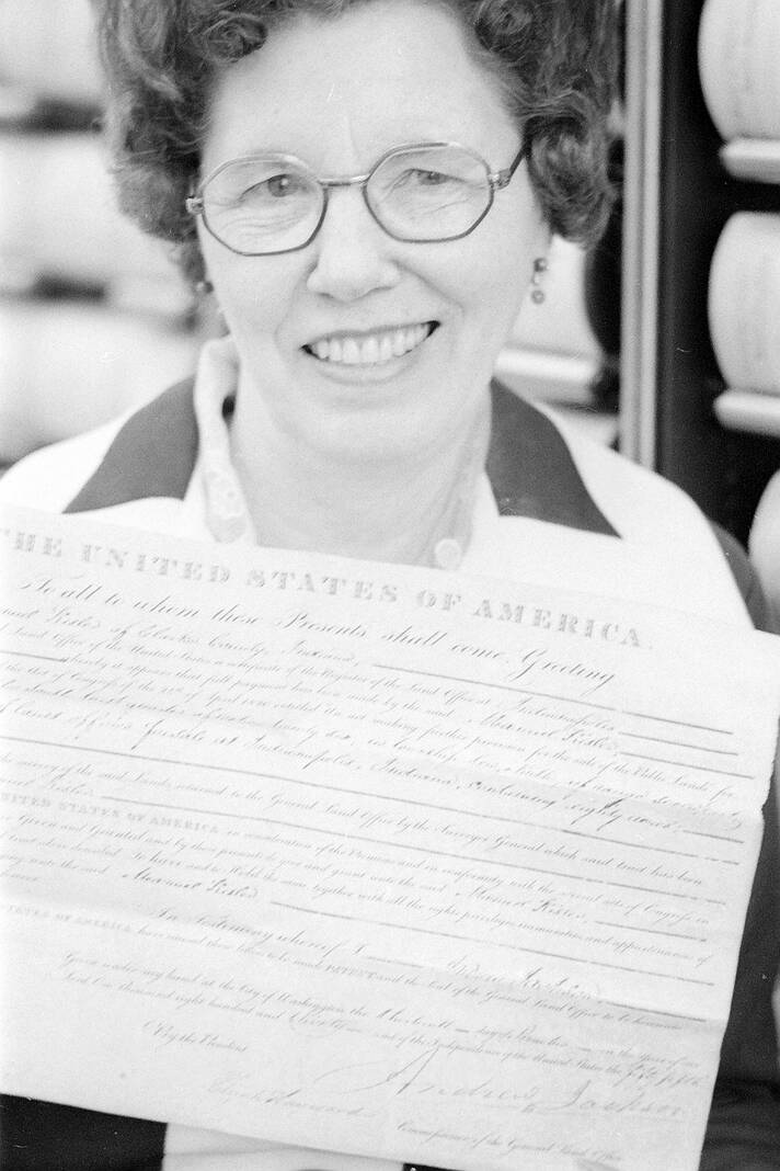 Helen Pankow, Bartholomew County recorder, holds a deed which bears the signature of President Andrew Jackson on Oct. 29, 1974. The document was donated to the Historical Society by the Bartholomew County Commissioners.