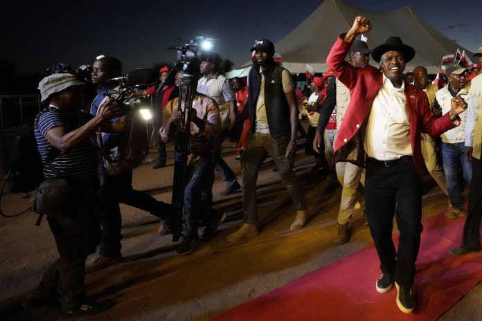 On the eve of the election, Masisi held a boisterous final campaign rally in the capital, Gaborone, wearing a bright red suit jacket — the color of his party — and dancing with supporters.