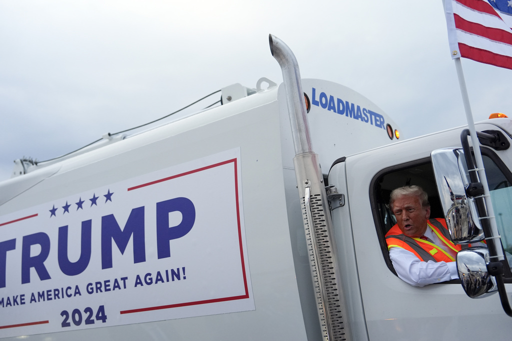 GREEN BAY, Wis. (AP) — Donald Trump walked down the steps of the Boeing 757 that bears his name, walked across a rain-soaked tarmac and, after twice missing the handle, climbed into the passenger seat of a white garbage truck that also carried his name.