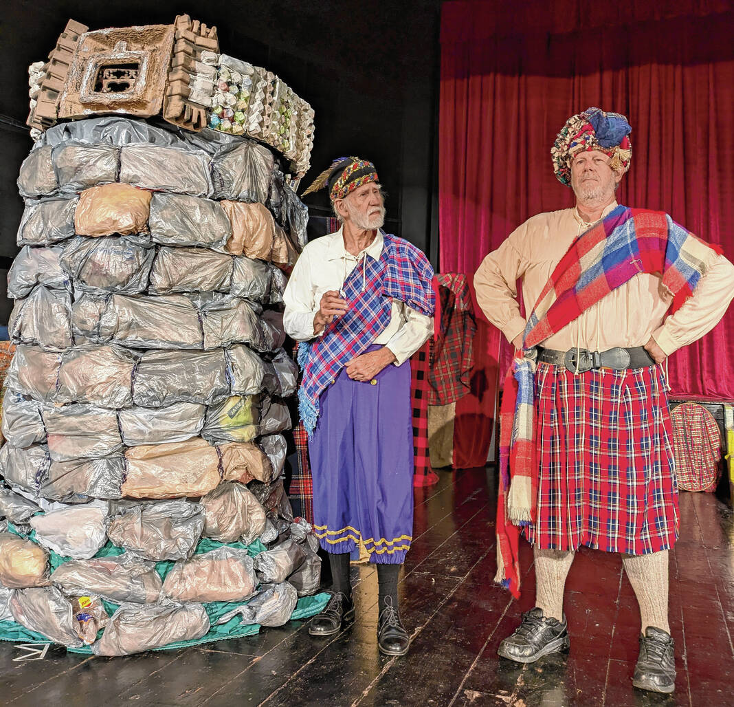 Photo provided Laird Tyndall, portrayed by Michael Beavin, rehearses a scene with Laird Drummond, played by Kevin Spiker, from the 21st Fairy Tale Musical Theatre production written by Cecile Beavin. The stage production of “Great Adventures on Tyndall Isle” will be performed at 2:30 p.m. on Tuesday, Nov. 10, at the Pixy Theatre in Edinburgh.