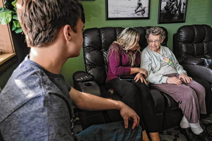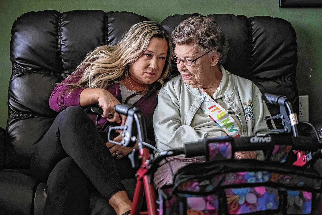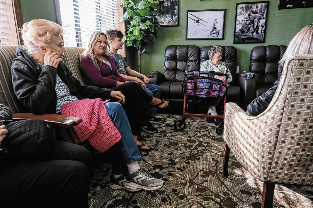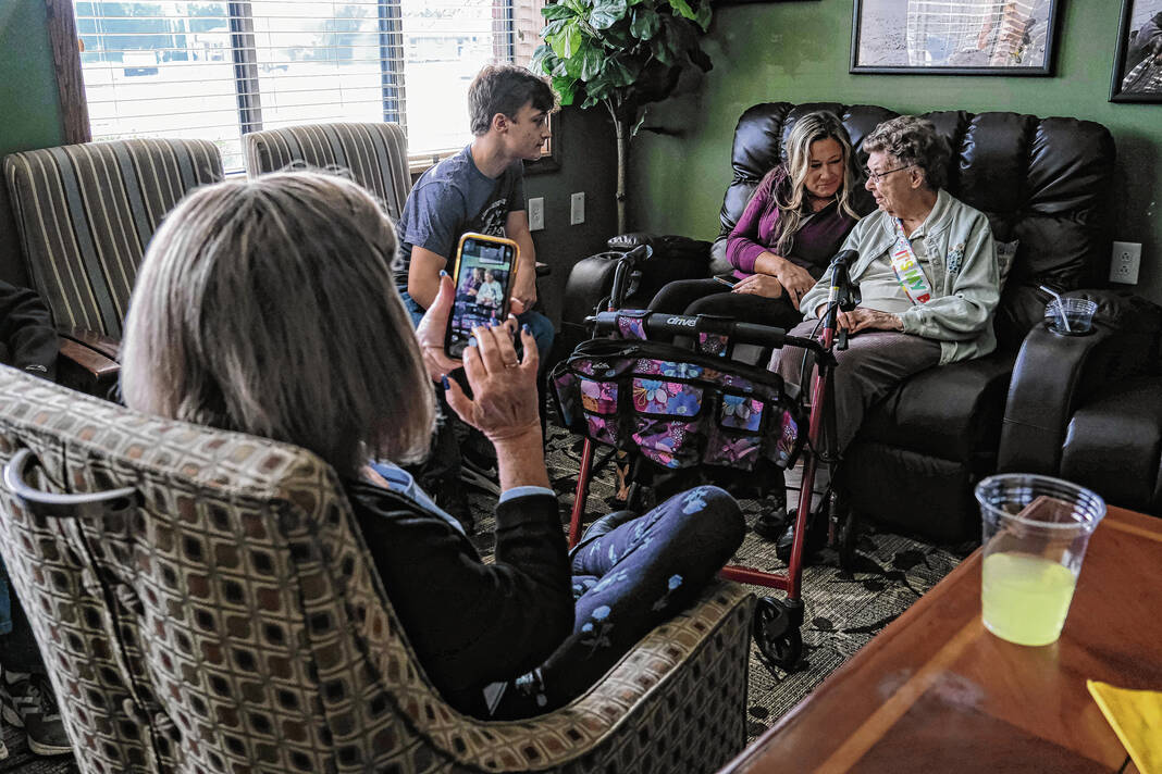 Mike Wolanin | The Republic Verna West, from right, chats with her ex-granddaughter-in-law Amber Potts and her great grandson Carson Fonner as she celebrates her 102nd birthday at Willow Crossing Health and Rehabilitation in Columbus, Ind., Tuesday, October, 29, 2024.