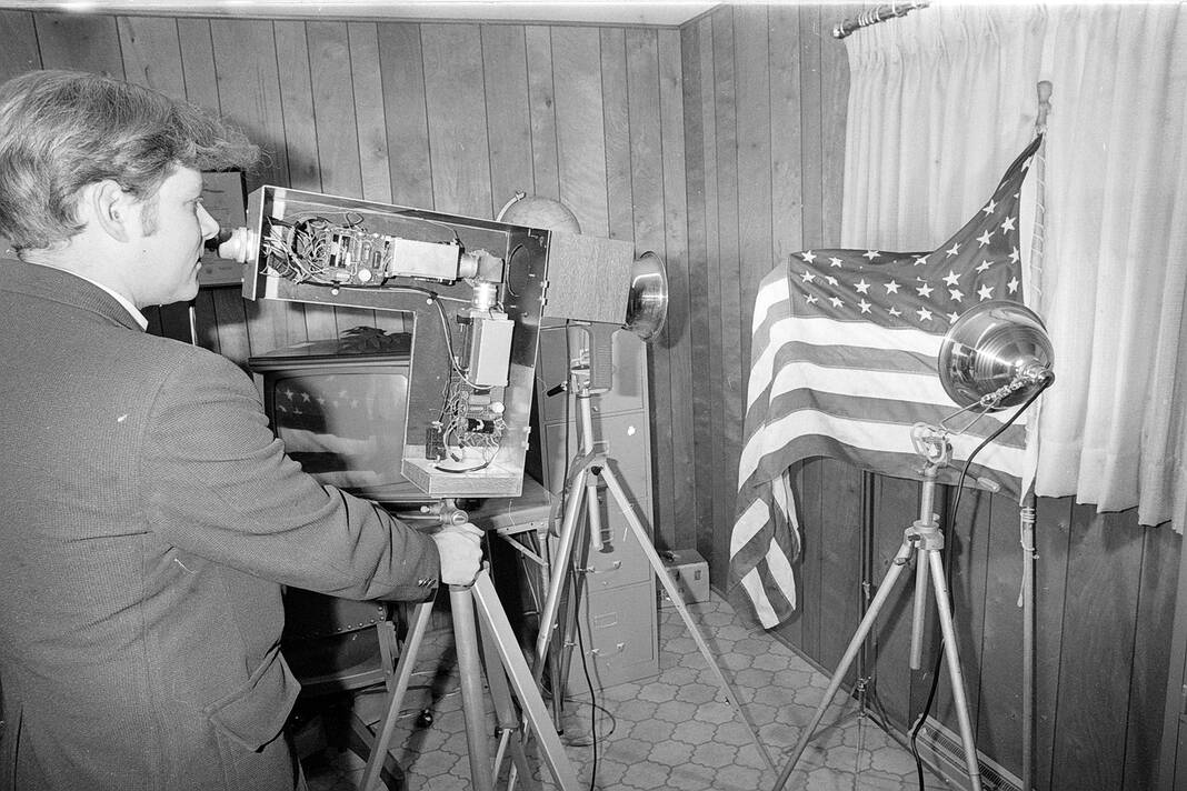 Amateur electronics hobbyist Gary Davis tunes in his homemade color television camera at a home workshop in Columbus on Nov. 1, 1974. Davis said the camera was the first ever created for television using his methods.