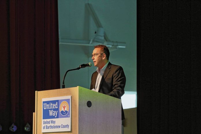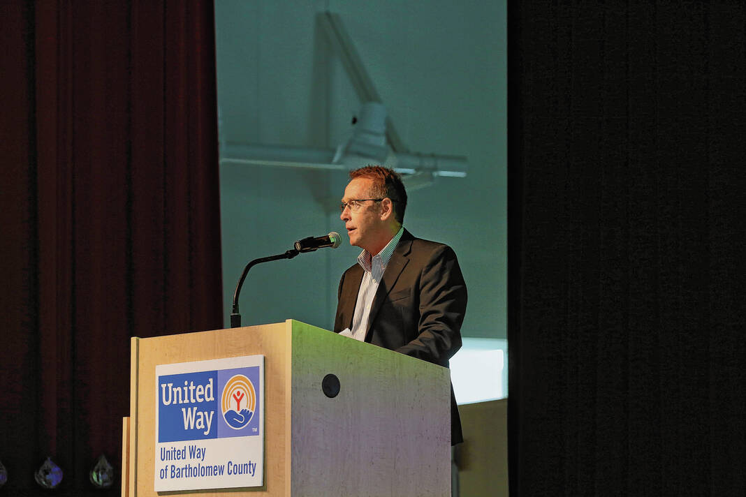 Carla Clark | For The Republic Mark Stewart, president of the United Way of Bartholomew County, speaks during the United Way of Bartholomew County annual meeting at the Commons, Tuesday, June 18, 2024.