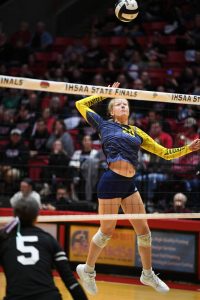 Trinity Lutheran’s Rachel Bonde goes up for a kill in the Class A State Final against Faith Christian on Saturday at Ball State’s Worthen Arena.