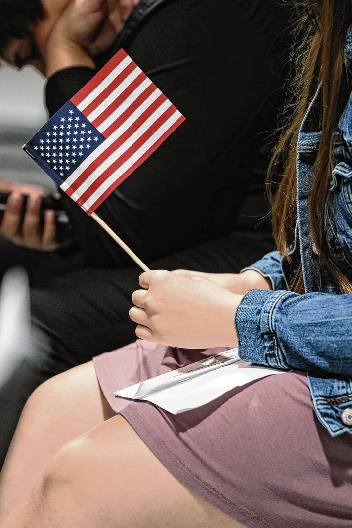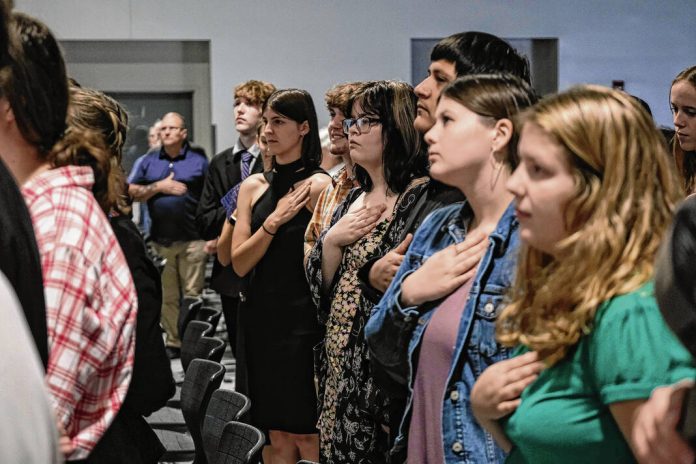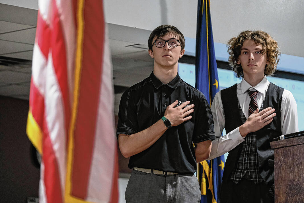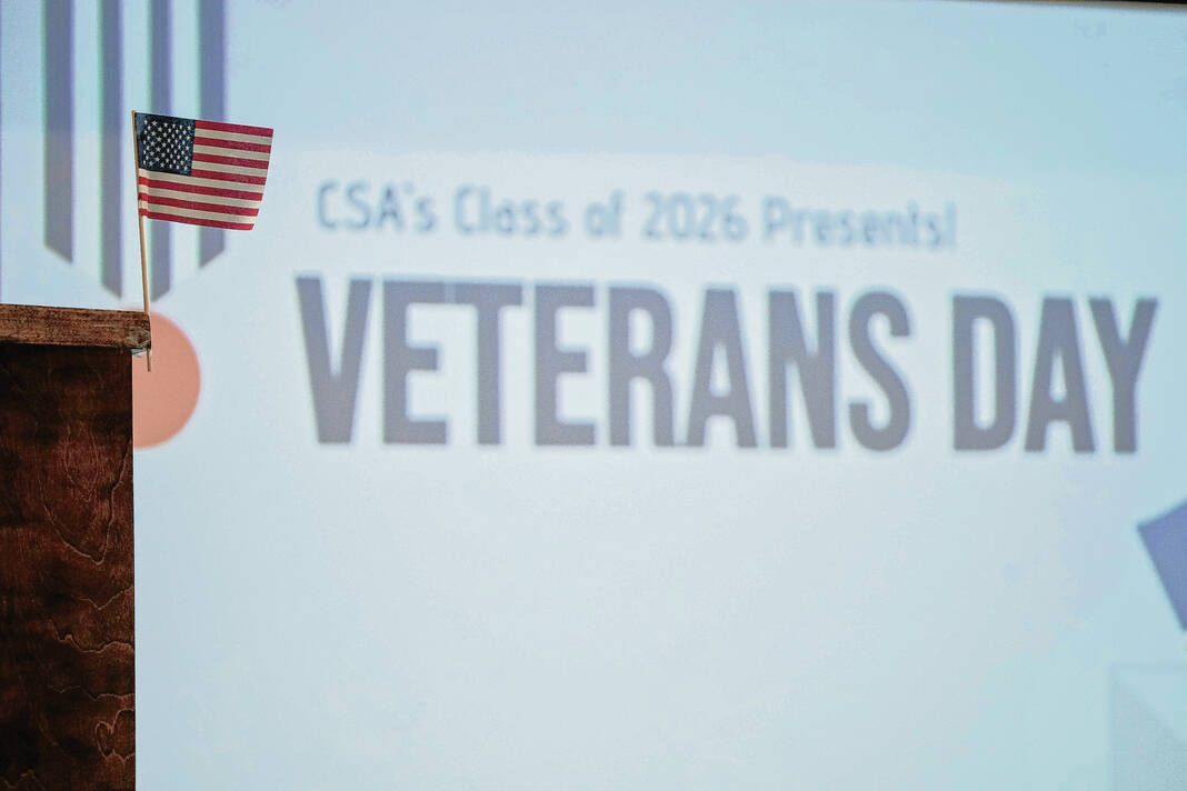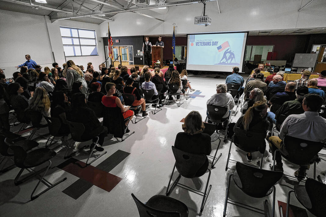 Mike Wolanin | The Republic CSA New Tech students hold their hands over their hearts during the playing of the national anthem for a Veterans Day presentation at CSA New Tech in Columbus, Ind., Monday, Nov. 11, 2024.