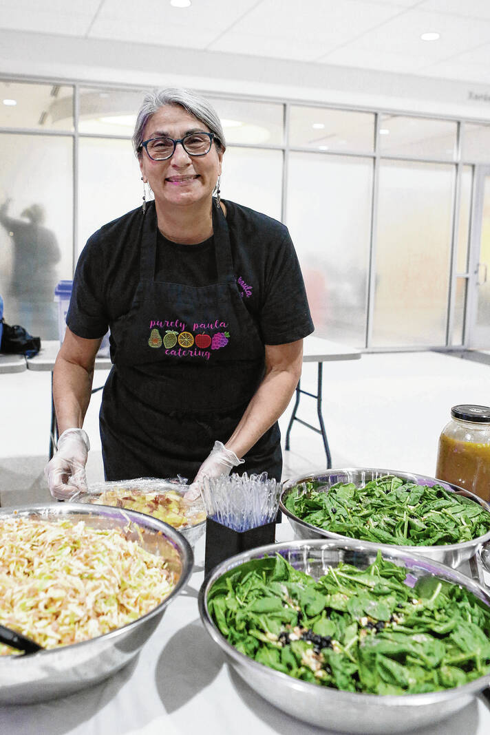 Carla Clark | For The Republic Paula Watson, Turining Point board chair and owner of Purely Paula Catering, prepares the buffet during The Not-So Family Feud fundraiser for Turning Point Domestic Violence Services at the Commons, Columbus, Ind. Thursday, November 14, 2024.