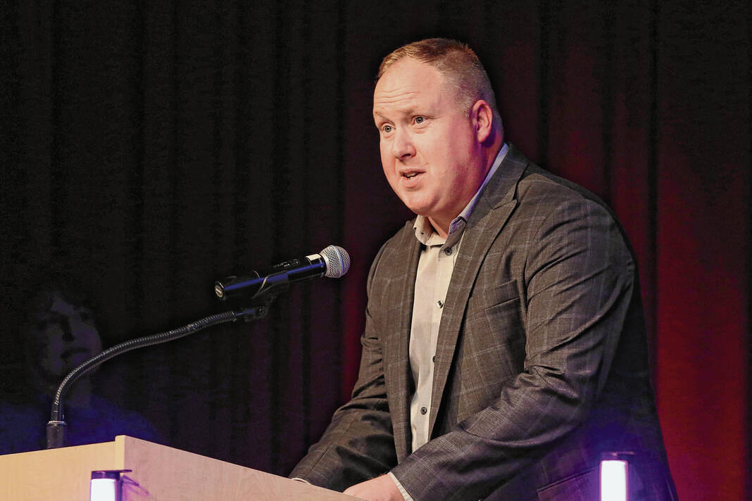 Carla Clark | For The Republic Wayne Fancher, Turning Point director of residential services, presents the Mission Partner award during The Not-So Family Feud fundraiser for Turning Point Domestic Violence Services at the Commons, Columbus, Ind. Thursday, November 14, 2024.