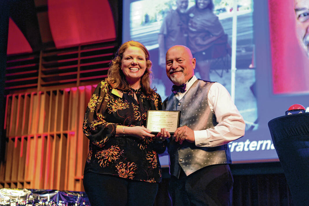 Carla Clark | For The Republic Whittney Loyd, Turning Point board president, presents the Community Impact Award to Alan Trisler and the Fraternal Order of Police during The Not-So Family Feud fundraiser for Turning Point Domestic Violence Services at the Commons, Columbus, Ind. Thursday, November 14, 2024.
