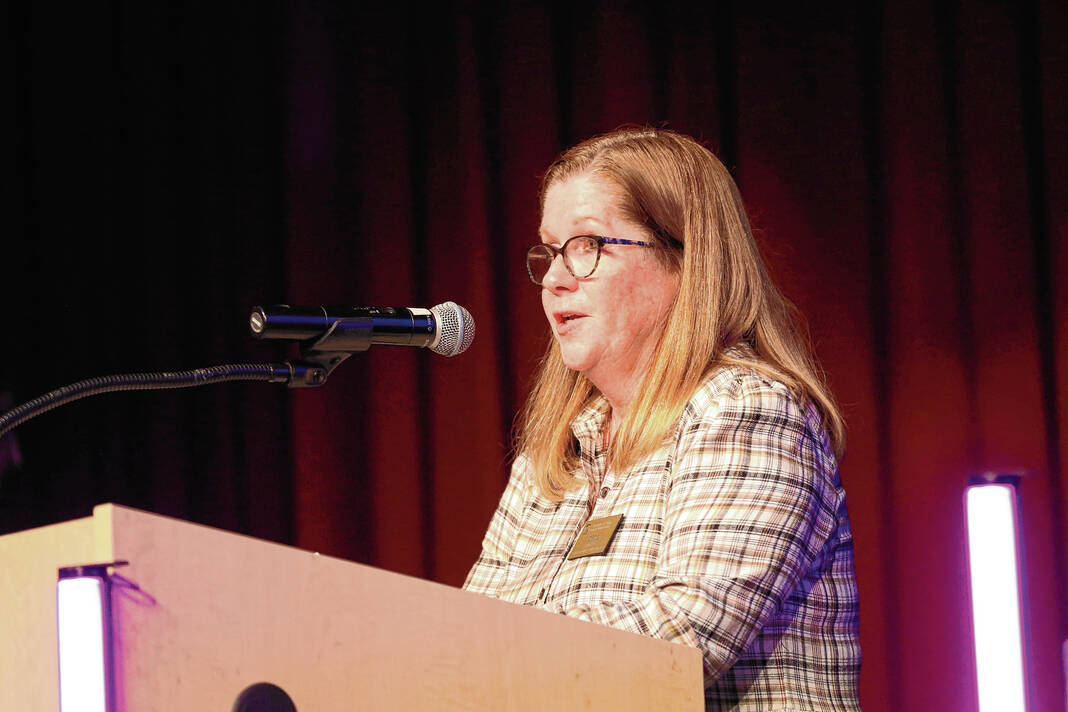 Carla Clark | For The Republic Dede Parker, Turning Point volunteer and in-kind donation coordinator, presents the Kris Kindelsperger volunteer of the year award Roxie Kindelsperger during The Not-So Family Feud fundraiser for Turning Point Domestic Violence Services at the Commons, Columbus, Ind. Thursday, November 14, 2024.