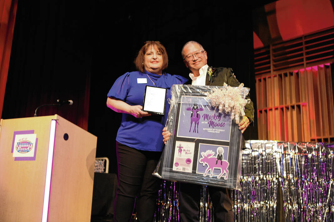Carla Clark | For The Republic Elisabeth Jones, Turning Point vice president of resource development, presents The Stand Up Award to Mickey Kim during The Not-So Family Feud fundraiser for Turning Point Domestic Violence Services at the Commons, Columbus, Ind. Thursday, November 14, 2024.