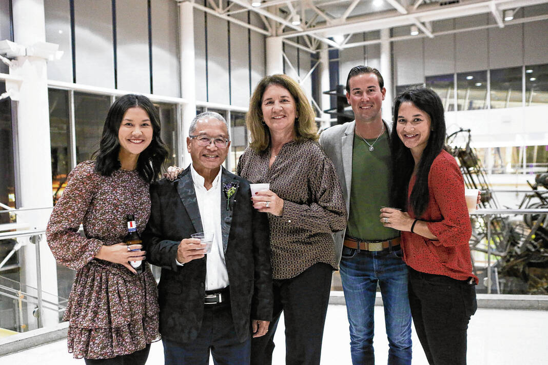 Carla Clark | For The Republic Mickey Kim, game show announcer, at left, with Team Turning Point Board and Family, Paul Malone, Julie Orben Jeff Caldwell and Kevina Schumaker during The Not-So Family Feud fundraiser for Turning Point Domestic Violence Services at the Commons, Columbus, Ind. Thursday, November 14, 2024.