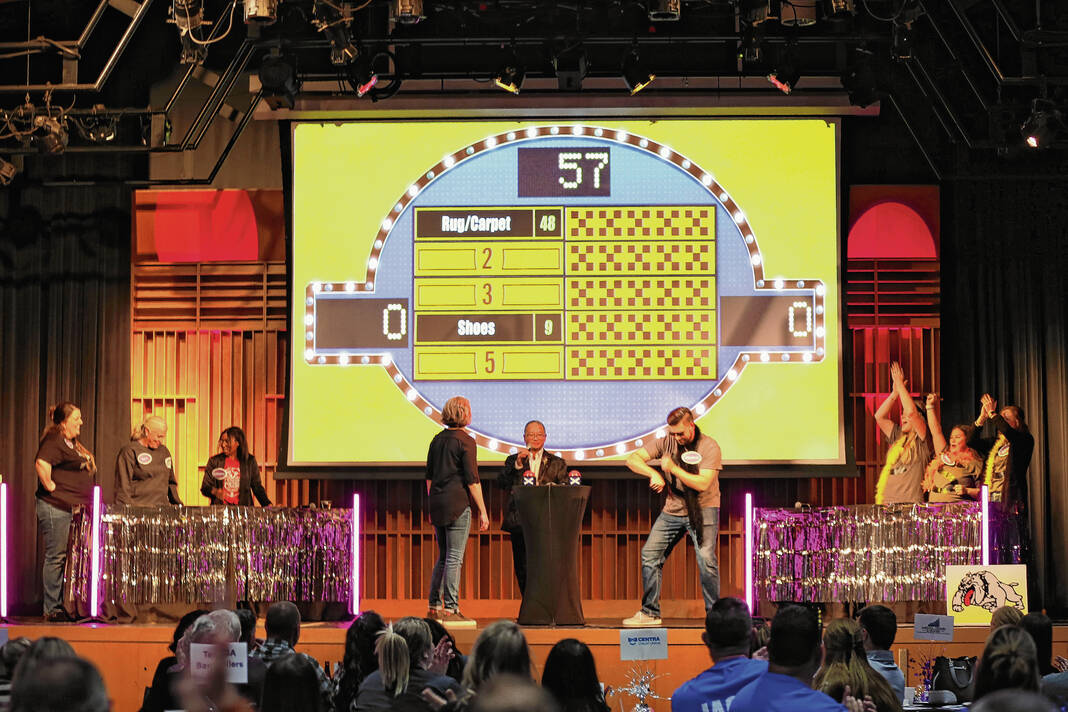 Carla Clark | For The Republic Team Piggy Bank Posse ( Centra) at left, James Nelson, Kassi Zeigler, Debbie Barber and Jacob Evans, competes with Team GA Bank Rollers (German American), Kim Bennett, Jerrie Posey, Jenny Gilley and Scott Ballard, during The Not-So Family Feud fundraiser for Turning Point Domestic Violence Services at the Commons, Columbus, Ind. Thursday, November 14, 2024.