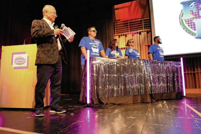 Carla Clark | For The Republic Mickey Kim, game show announcer, with Team Turning Point Board and Family celebrating a correct answer during The Not-So Family Feud fundraiser for Turning Point Domestic Violence Services at the Commons, Columbus, Ind. Thursday, November 14, 2024.