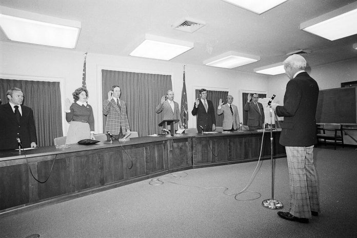 Columbus Mayor Max Andress swears in newly elected members of the Bartholomew County Council on Nov. 16, 1974, in the county courthouse. Members of the council from the left are Glen Robert Harden, Wanda C. Hunter, Marvin Finke, Clarence Schwartzkopf, Karl Foster, Max F. Ziegler and Eugene McCammon.