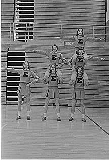 Columbus East High School cheerleaders cheered for the Olympians as they played against Floyd Central in the 1974-75 basketball season opener on Nov. 23, 1974. The girls, first row, from left, are Amy Schwartzkopf, Lynn Bealmear and Cheryl Woods. Second row, from left, are Karen Smith and Wendy Dwenger. Vicki Gullett is on the top row.