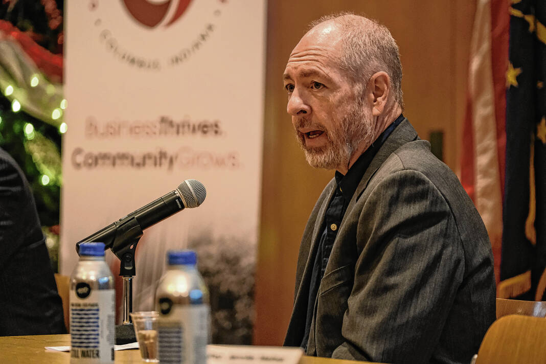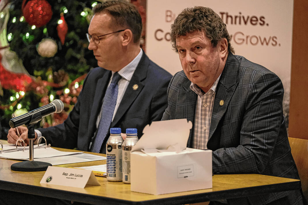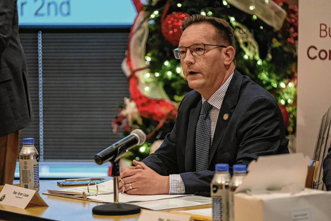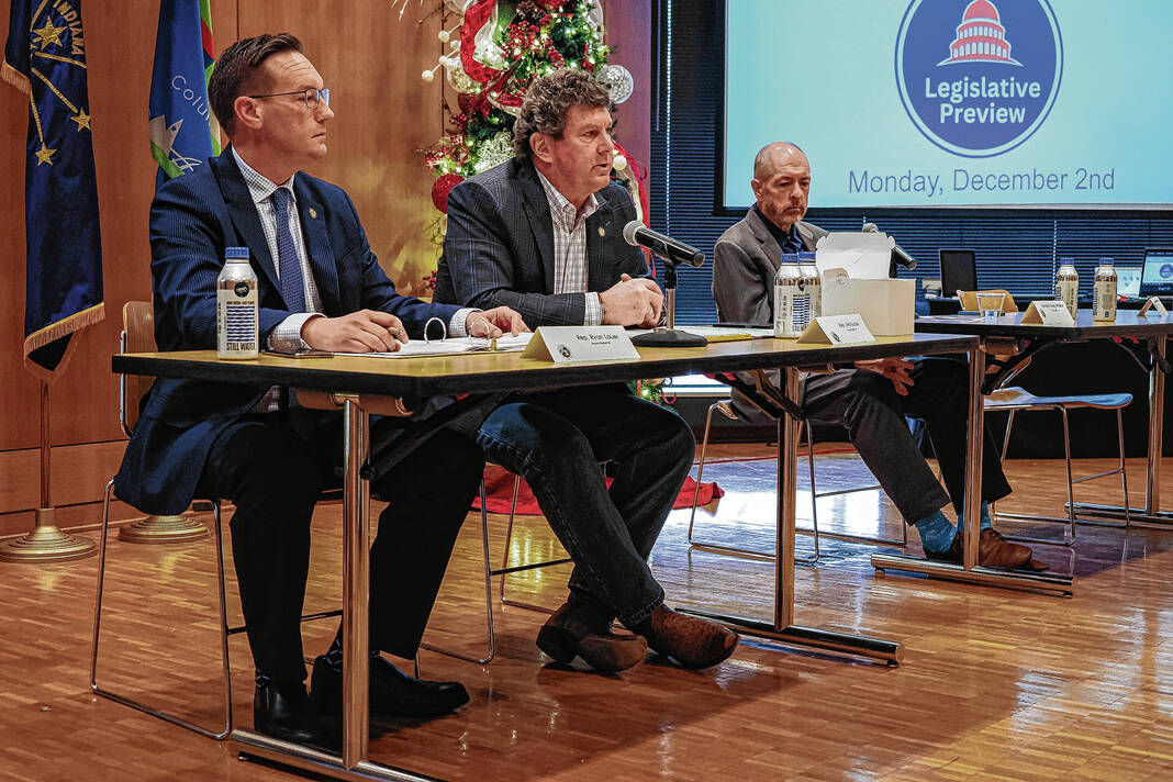 Mike Wolanin | The Republic State Representatives Ryan Lauer, from left, Jim Lucas and State Sen. Greg Walker take part in a legislative preview session at Columbus City Hall in Columbus, Ind., Monday, Dec.2, 2024.