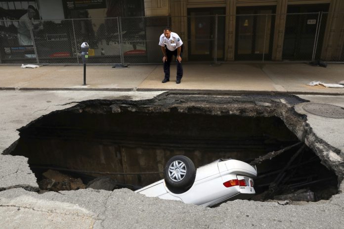 In June, a giant sinkhole in southern Illinois swallowed the center of a soccer field built on top of a limestone mine, taking down a large light pole and leaving a gaping chasm where squads of kids often play. No one was hurt.
