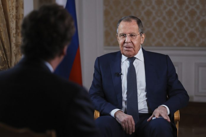 MOSCOW (AP) — Russia’s top diplomat said in an interview with former Fox News host Tucker Carlson released Friday that Moscow doesn’t want a war with the United States but will use “all means” to defend its interests.