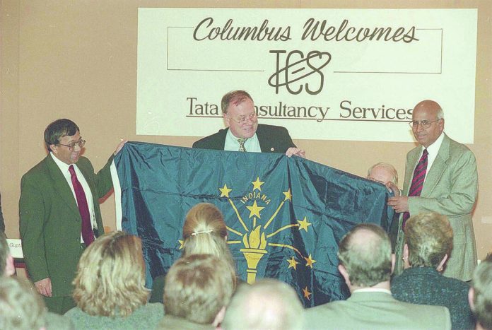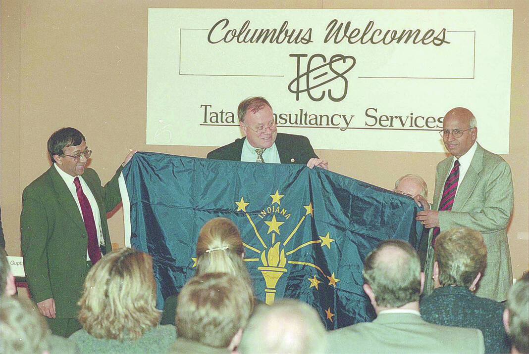 Tom McKenna, executive director of the Indiana Department of Commerce, presents a state flag to Arup Gupta, left, and S. Ramadorai, CEO of Tata Consultancy Services, which opened a new facility in Columbus on Dec. 7, 1999.