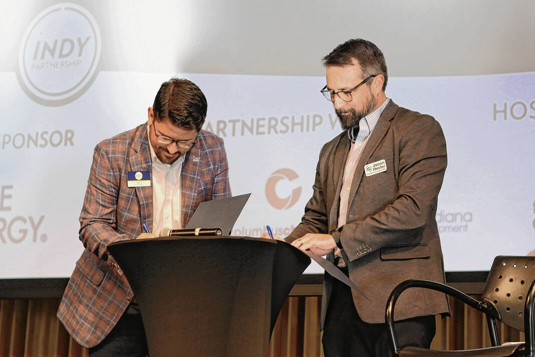 Jason Hester, president of the Greater Columbus (Indiana) Economic Development Corporation, signed a memorandum of understanding (MOU) with Indy Partnership, a regional economic development organization, described by Matt Mindrum, Indy Chamber president and CEO, as similar to a “talent attraction agency.”
