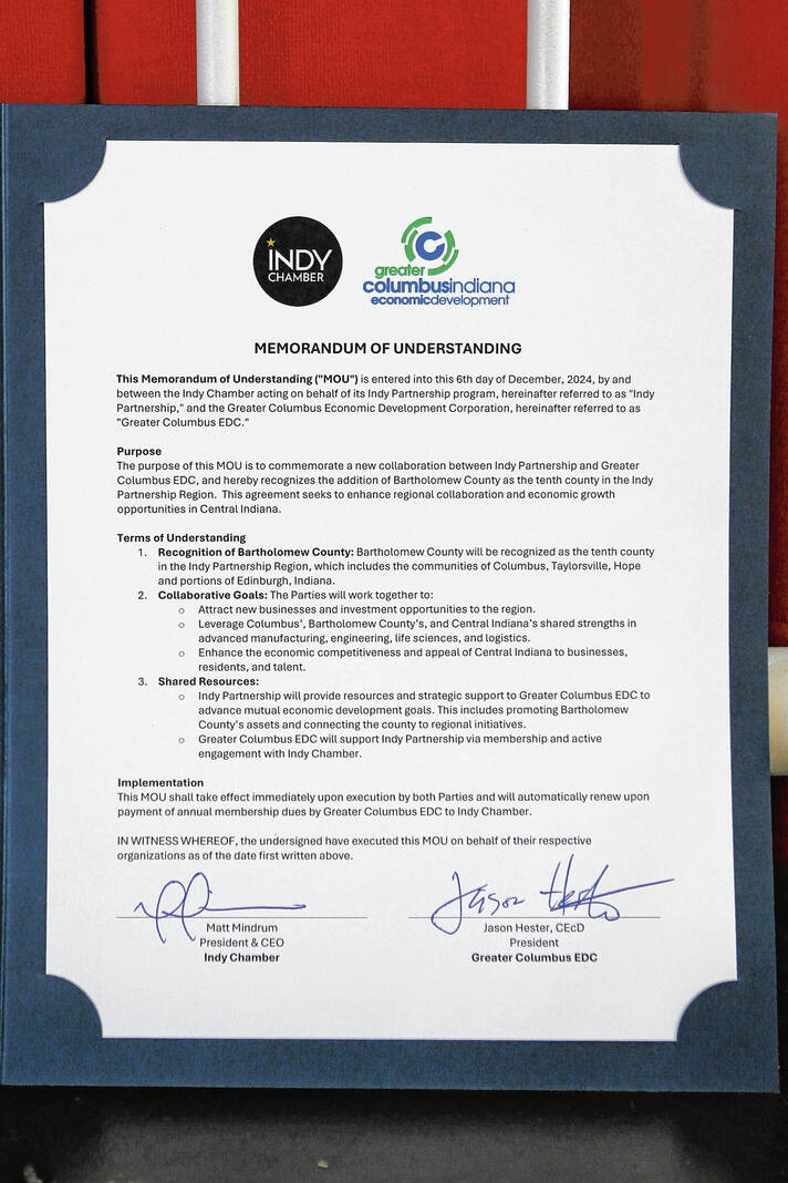 With Hester’s and Mindrum’s signatures on the agreement, Bartholomew County joins nine other central Indiana counties that are a part of the Indy Partnership service area, including: Marion, Hancock, Shelby, Johnson, Morgan, Hendricks, Boone, Hamilton and Madison counties.