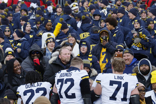 Michigan players celebrate their win over Ohio State in an NCAA college football game Saturday, Nov. 30, 2024, in Columbus, Ohio. (AP Photo/Jay LaPrete)