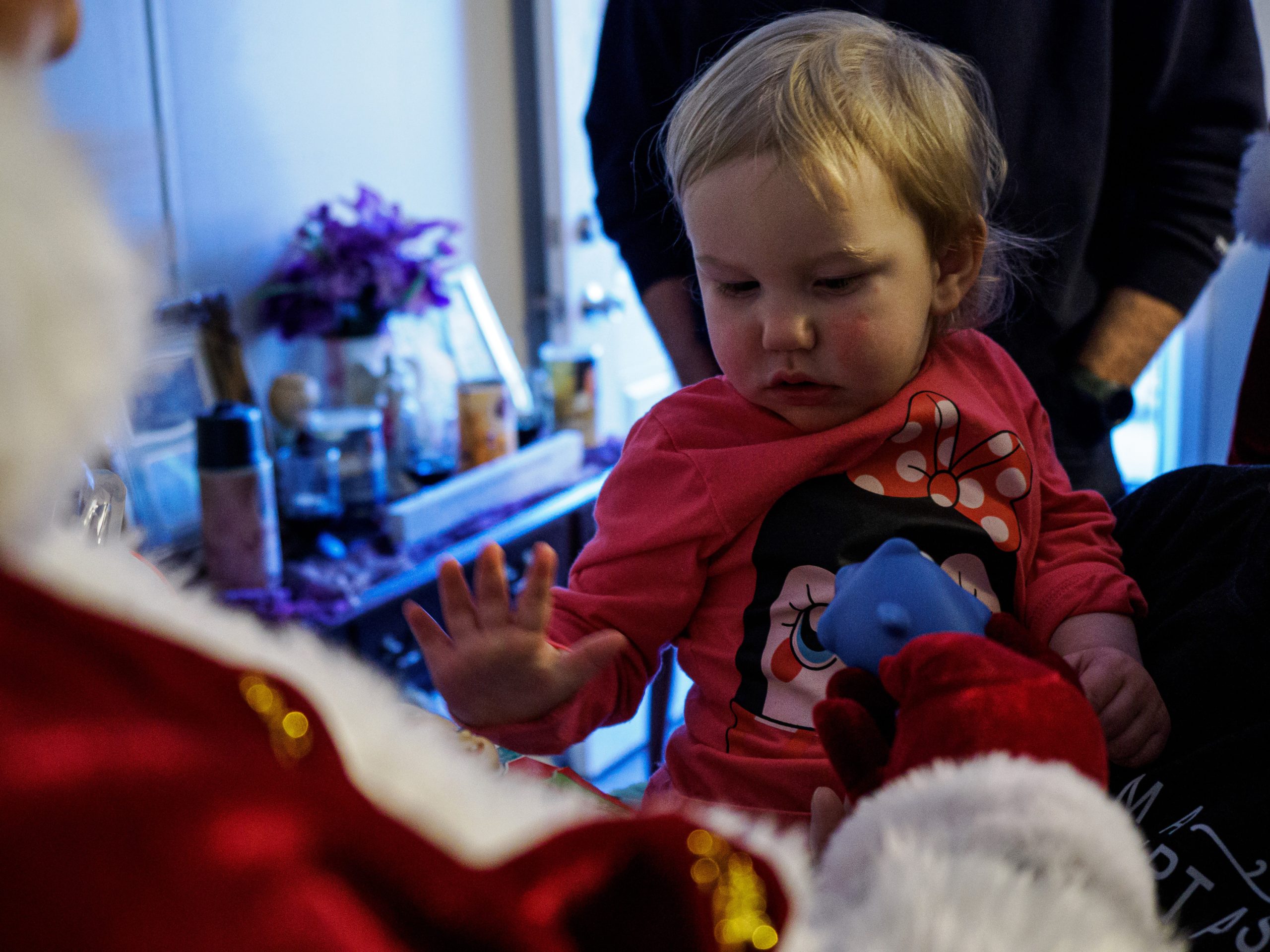 Mike Wolanin | The Republic Brynlee Yates reaches out play with toys from a Columbus Firemen’s Cheer Fund gift box at her home in Candlelight Village in Columbus, Ind., Saturday, Dec. 14, 2024.
