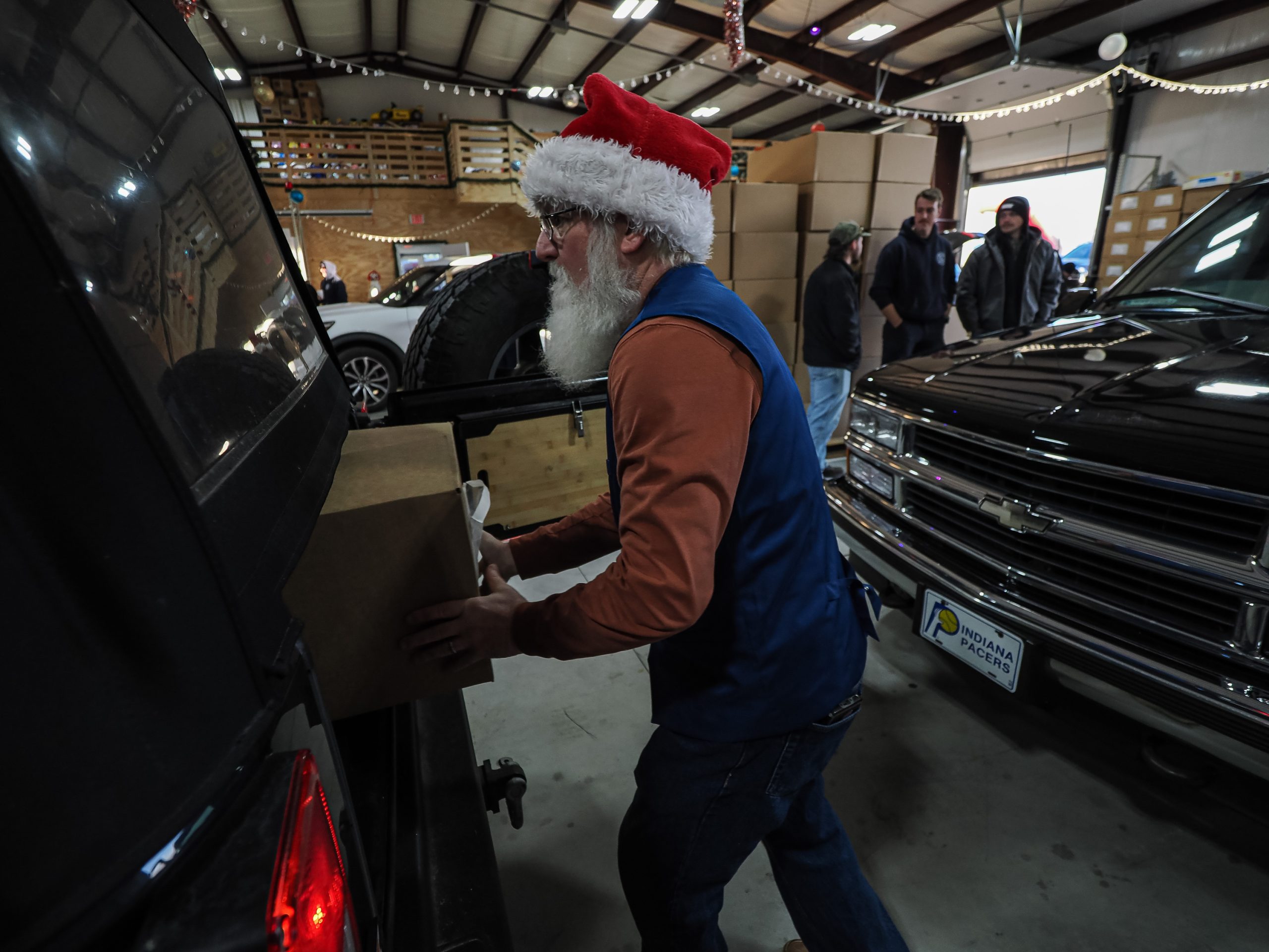 Mike Wolanin | The Republic Shawn McNealy loads a gift box on to the back of a truck on delivery day for the Columbus Firemen’s Cheer Fund at the cheer fund building in Columbus, Ind., Saturday, Dec. 14, 2024.