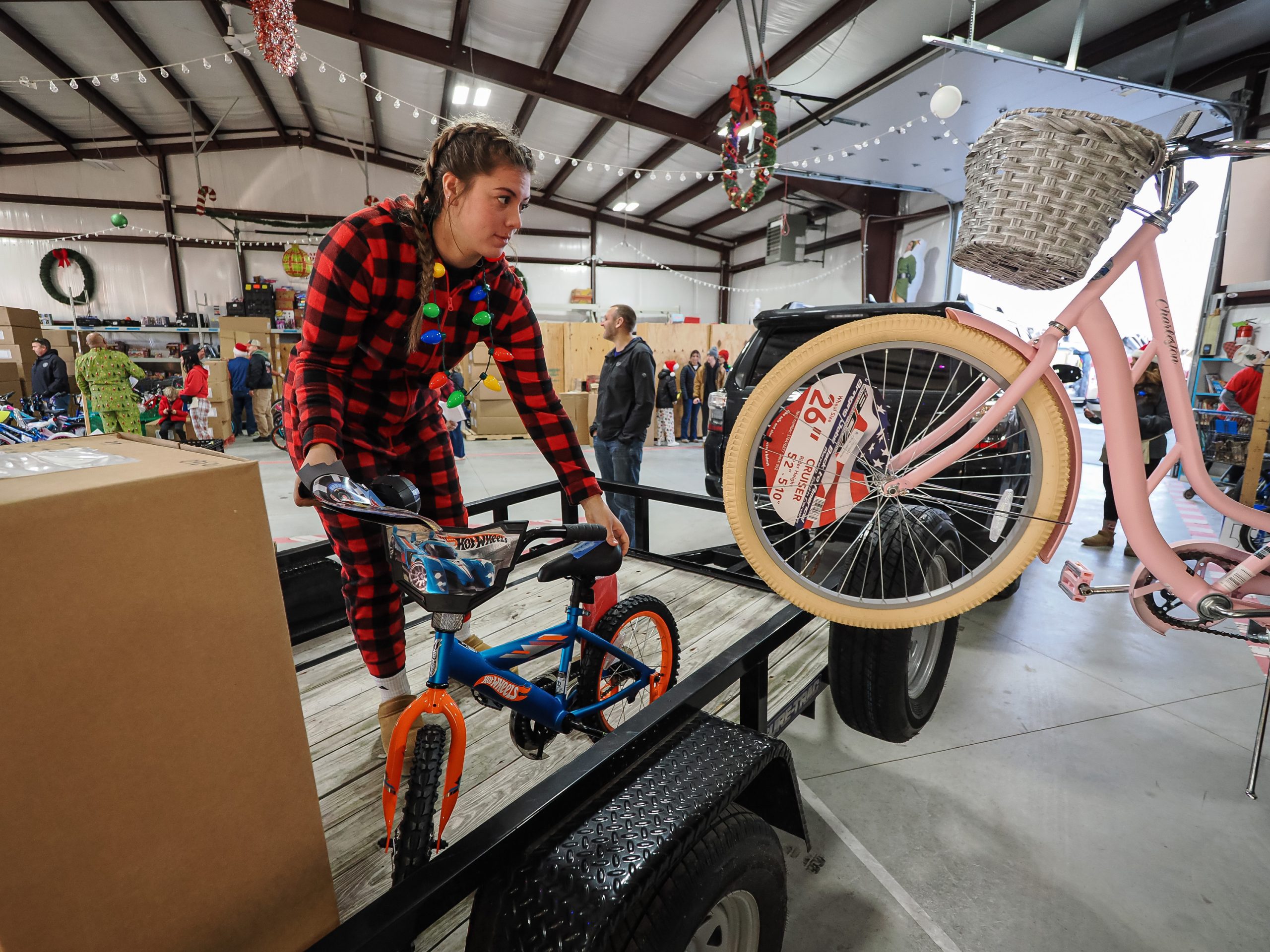 Mike Wolanin | The Republic Lucy Wilson loads a bicycle on to the back of a trailer on delivery day for the Columbus Firemen’s Cheer Fund at the cheer fund building in Columbus, Ind., Saturday, Dec. 14, 2024.