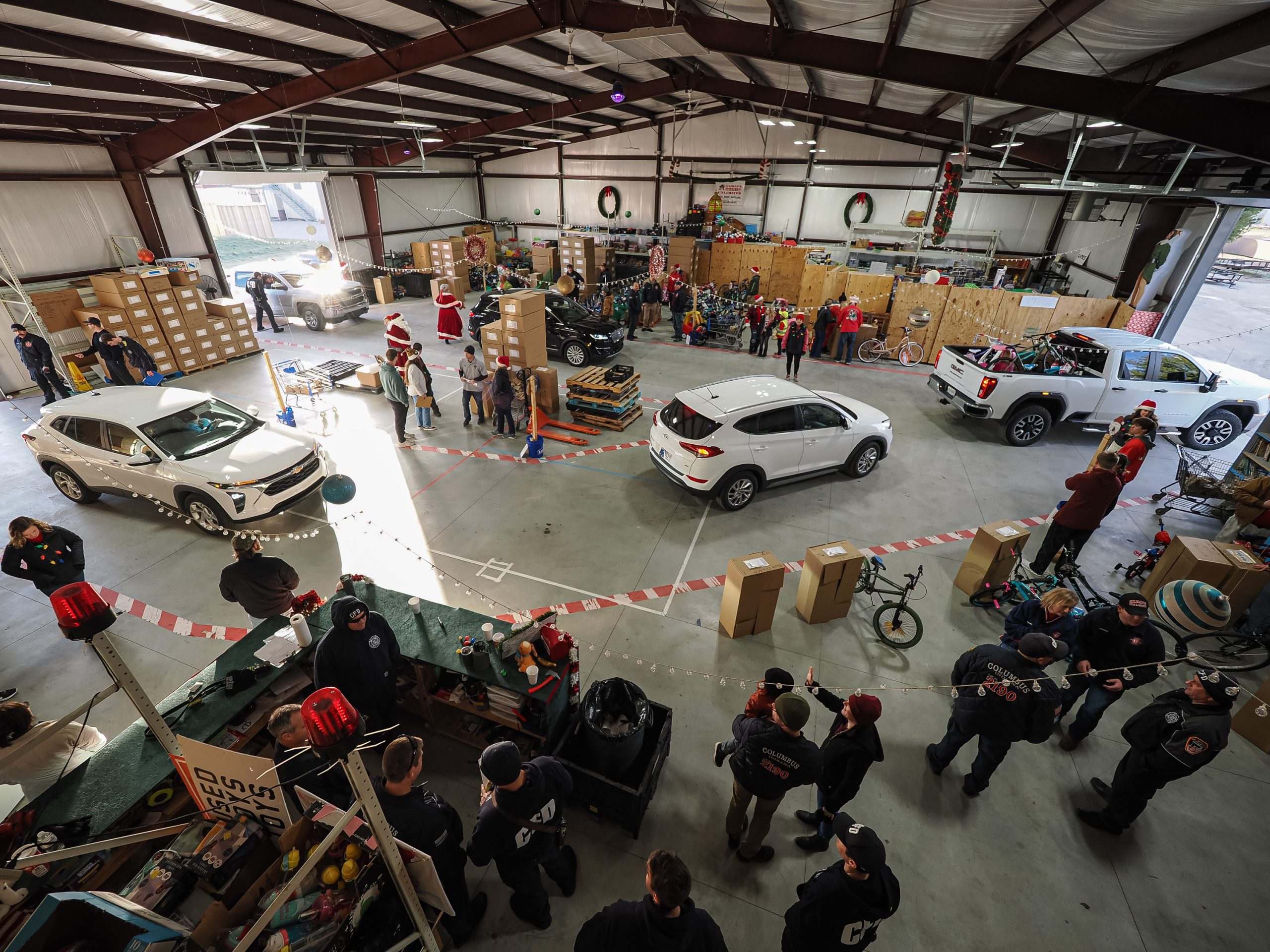 Mike Wolanin | The Republic Vehicles are loaded with gift boxes on delivery day for the Columbus Firemen’s Cheer Fund at the cheer fund building in Columbus, Ind., Saturday, Dec. 14, 2024.