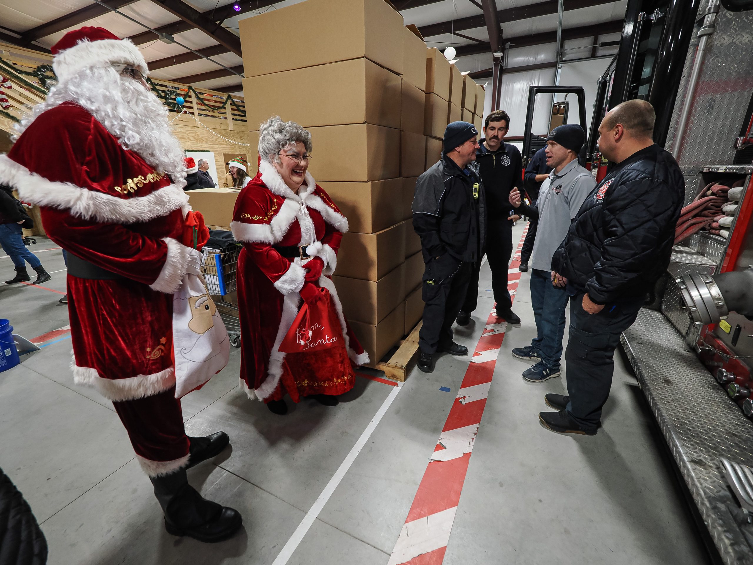 Mike Wolanin | The Republic Mark and Crissy Riley are dressed as Santa and Mrs. Claus to deliver a gift box for the Columbus Firemen’s Cheer Fund at the cheer fund building in Columbus, Ind., Saturday, Dec. 14, 2024.