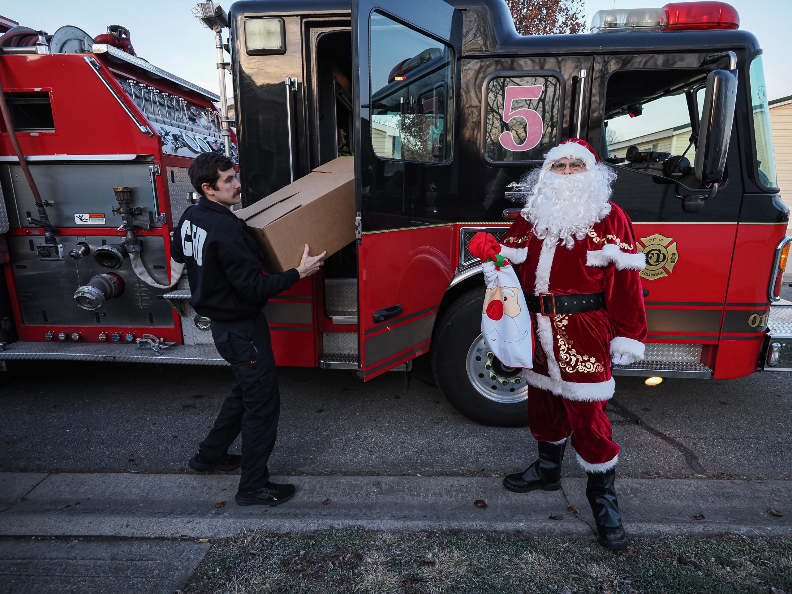 Mike Wolanin | The Republic Columbus firefighter Brayden Warfield, left, helps Mark Riley, dressed as Santa, deliver a gift box for the Columbus Firemen’s Cheer Fund in Candlelight Village in Columbus, Ind., Saturday, Dec. 14, 2024.