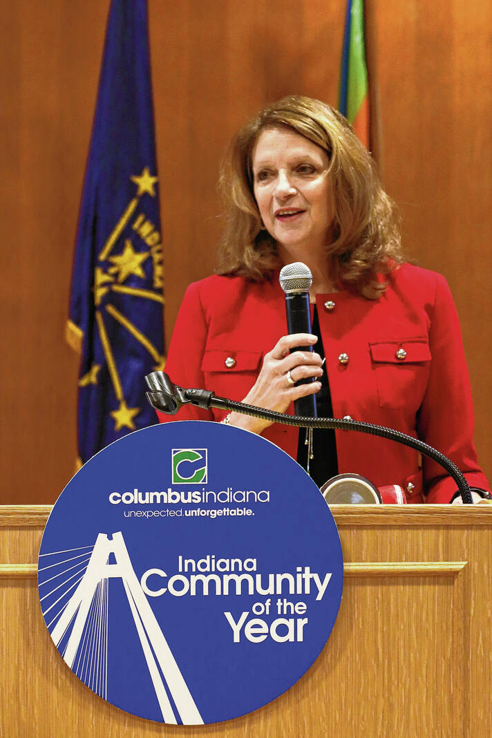 Carla Clark | For The Republic Luann Welmer speaks after being sworn in as clerk during the City of Columbus elected officials swearing in ceremony in the Cal Brand meeting hall at the city hall in Columbus, Ind. Monday, January 1, 2024.