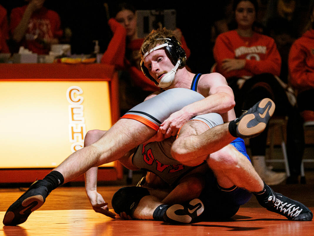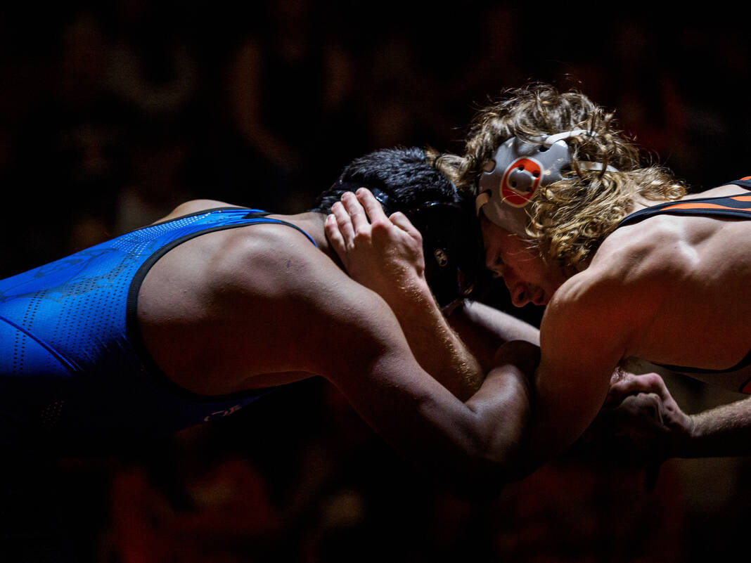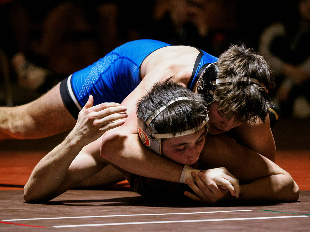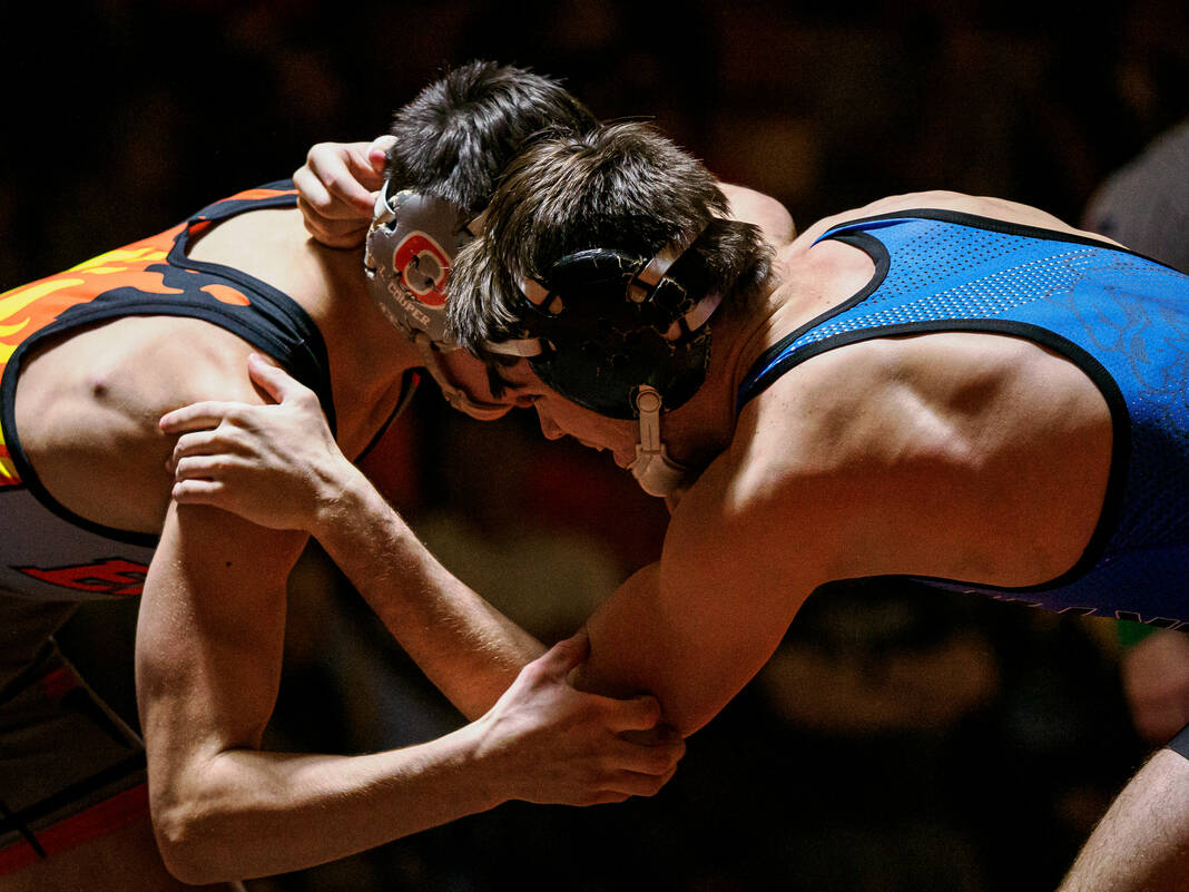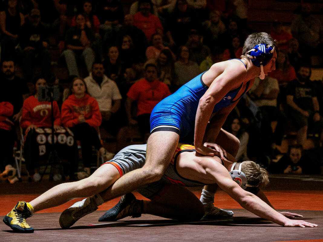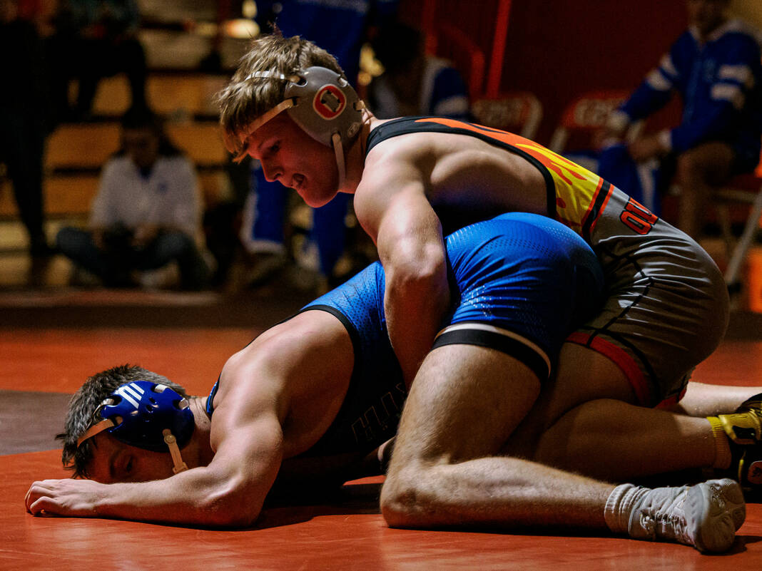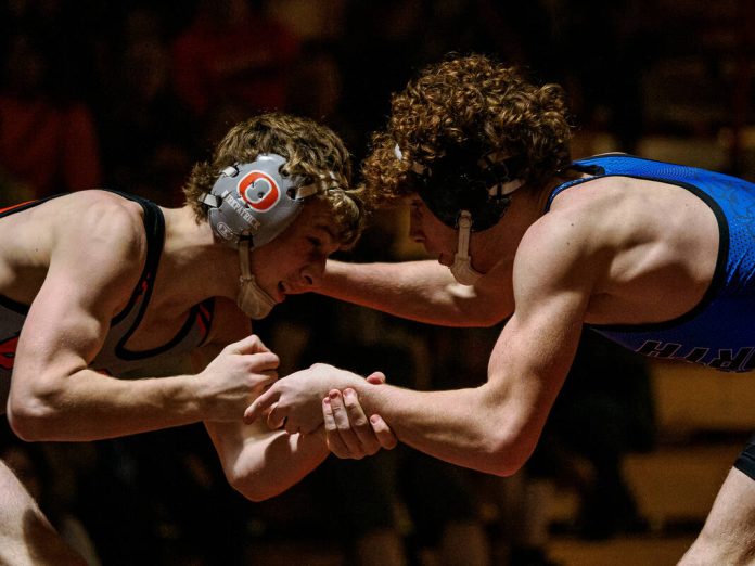 Starting at 126, the Bull Dogs struck first with Ty Brueche’s 16-9 decision against Wyatt Behnke. But then the Olympians got a forfeit win from Brian Findley at 132, a pin from ninth-ranked Gage Rutan at 138, a 1-0 decision from 18th-ranked Caleb Kirkpatrick against Cohen Long at 144 and a 4-0 decision from 13th-ranked Caleb Cooper against Luke Spurgeon at 150 to take an 18-3 lead.