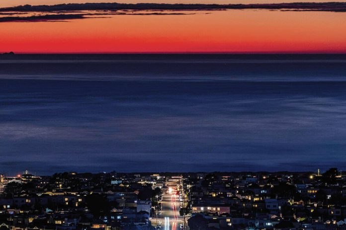 FILE - Vehicles travel along a street at sunset on the winter solstice in San Francisco, Thursday, Dec. 21, 2023. (Stephen Lam/San Francisco Chronicle via AP, File)
