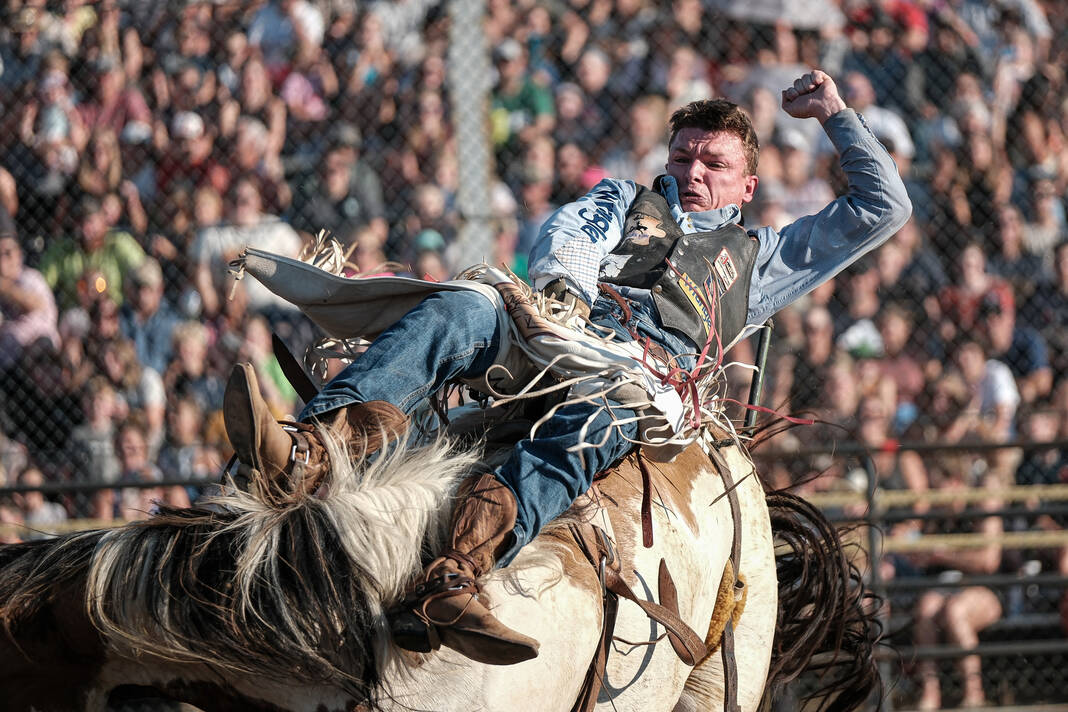 Mike Wolanin | The Republic Mark Kreder, of Claremore, Okla., competes in the bareback riding portion of the 3 Bar J Rodeo during the Bartholomew County 4-H Fair at the Bartholomew County Fairgrounds in Columbus, Ind., Monday, June 24, 2024.