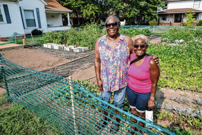 Mike Wolanin | The Republic Shirley Jefferson, left, and Judy Jackson pose for a photo in the Calvary Community Church Garden of Eden in Columbus, Ind., Thursday, July 25, 2024. Jackson and Jefferson helped start the community garden.